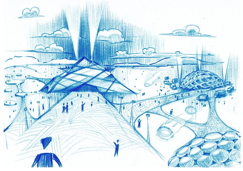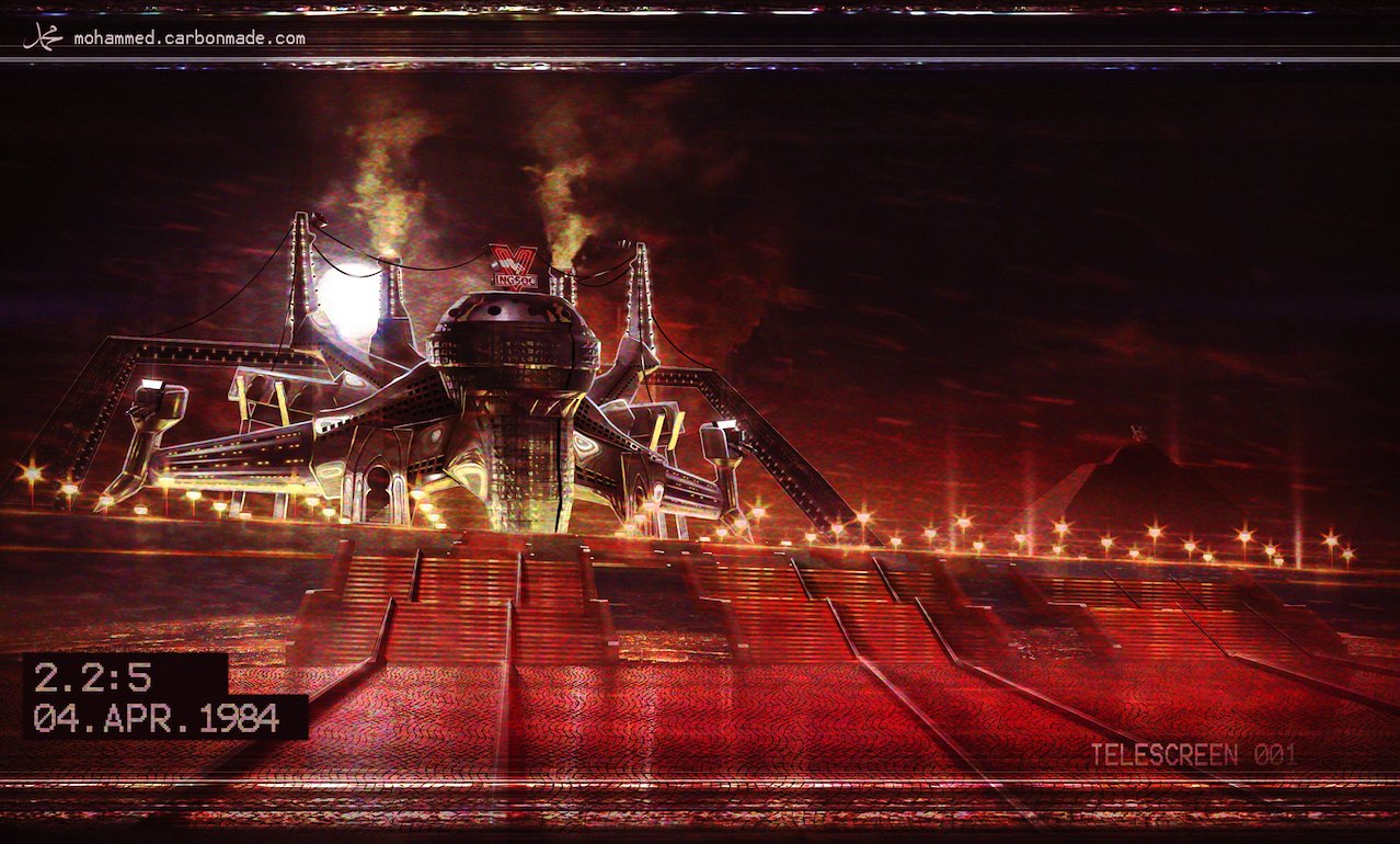Title: Airstrip Nine - I have always loved the book 1984. Ever since reading it at sixteen, it's dark, imposing imagery and has stuck with me. This illustration explores one of the party buildings in other provinces of Oceania, hence the name, seen through the view of a telescreen. You can see the more familiar Ministry of truth like stucture in the background. Fun Fact. When I initially penciled the layout for this drawing I had planned for it to be a vision of a futuristic mosque. That didn't last long when I realised how fitting it could look in an Orwellian universe.