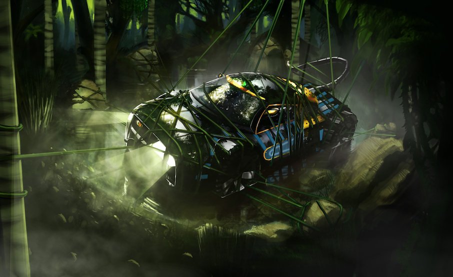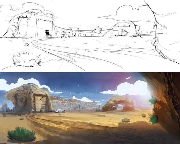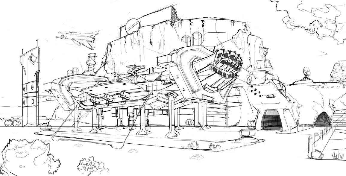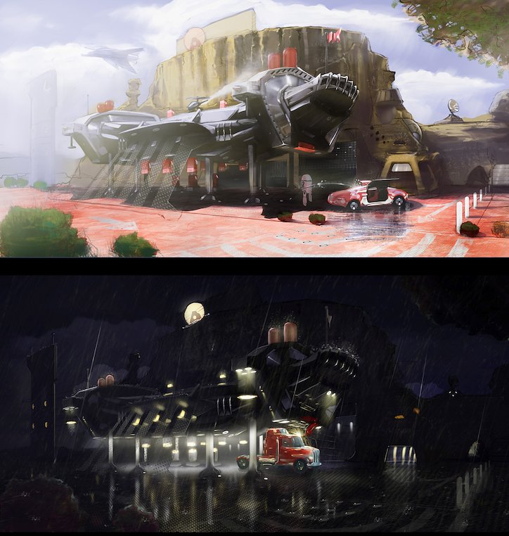 Title: Boulder Hill Petrol Station - I created this image based on a cartoon from the 80s (http://www.youtube.com/watch?v=o2Z1yLO9C-Q) to serve as a storytelling backdrop for one of the cars I was redesigning for a university project. Fun Fact: I made both a daylight scene and a night time scene on the same canvas because I didn't want to decide between the two.