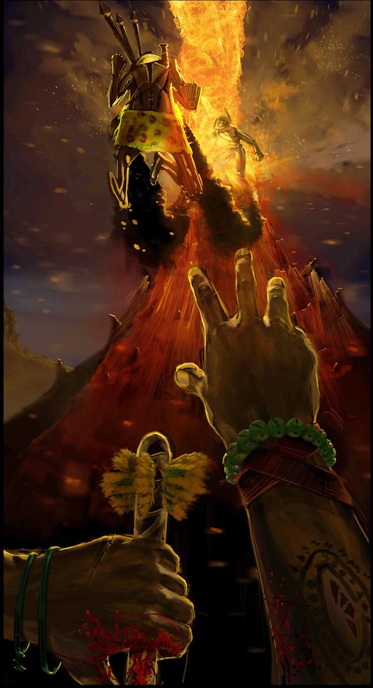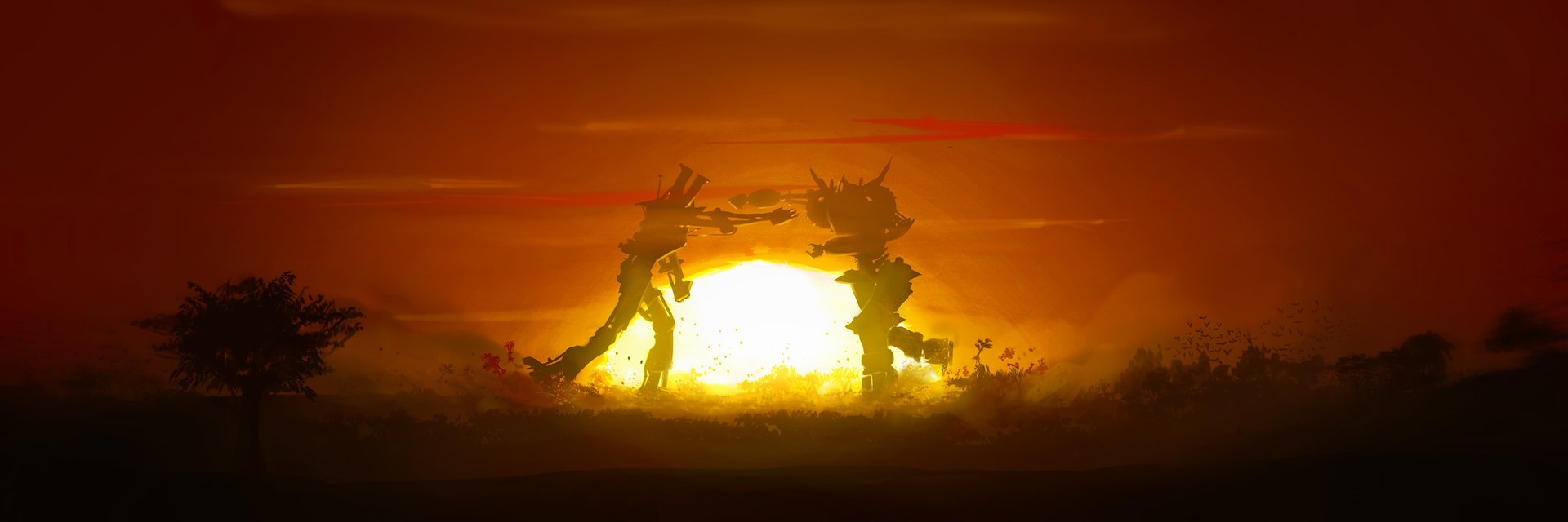 Title: Rumble in the jungle – A battle between classic American and Japanese style robots duking it out somewhere on middle ground. Their poses reference famous boxers of different eras