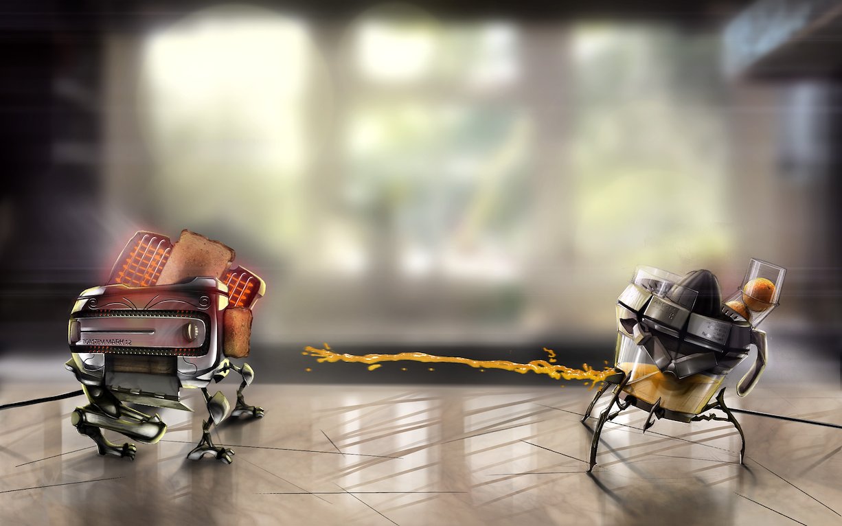 Title: Breakfast Wars - Wouldnt it be great if mundane kitchen appliances could transform into visceral war machines? Fun Fact: While I was doing this illustration I watched Transformers Revenge of the Fallen and it featured a shot with transforming kitchen appliances. Great minds think alike, I say. Check out tutorial